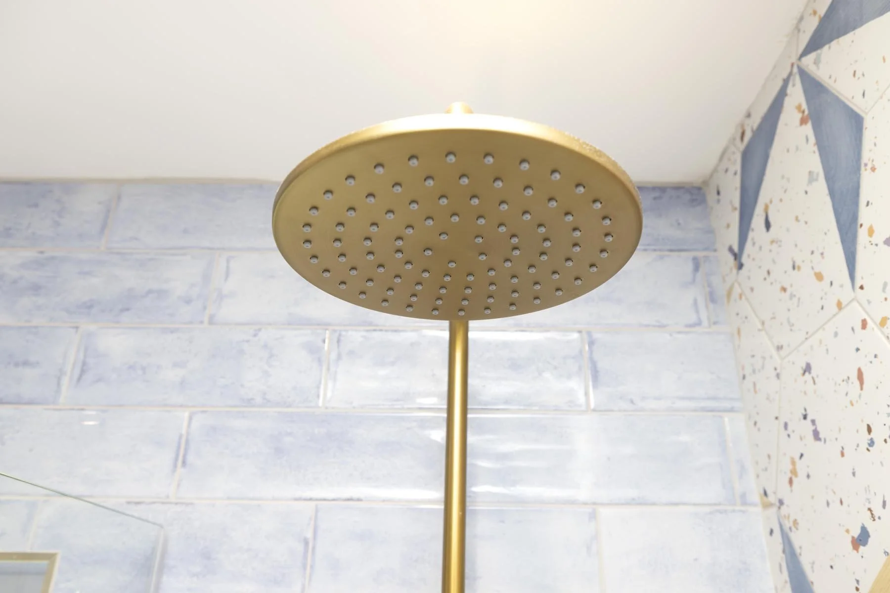 A vibrant Mediterranean-style shower room with patterned feature tiles, soft blue brickwork, and brushed brass fixtures. A bold and colourful design that brings warmth and personality to this coastal home.