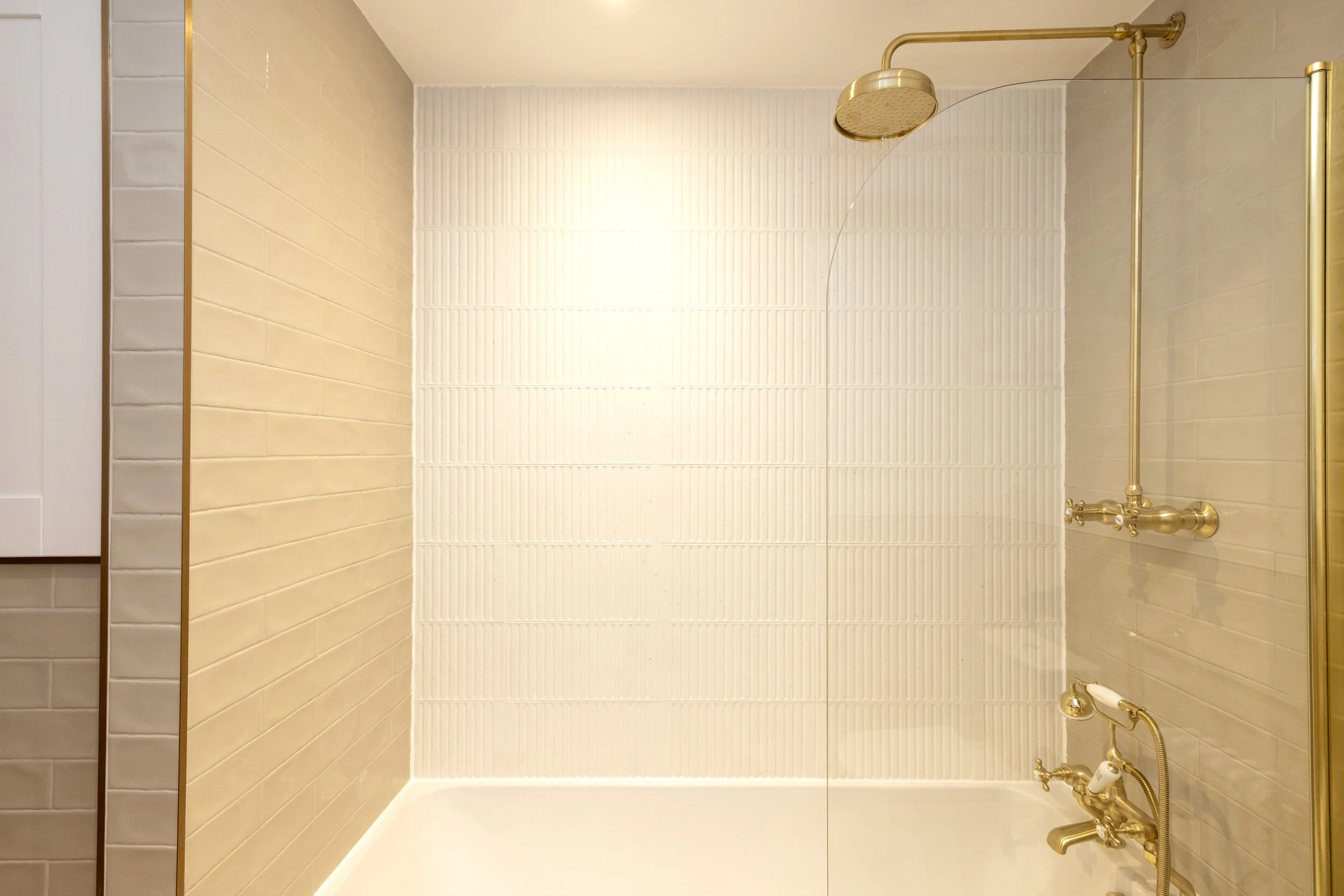 A refined, classically styled bathroom featuring brushed brass fixtures, soft neutral tiling, and a bespoke vanity. Timeless materials and expert detailing give this space a luxurious, heritage feel with all the benefits of modern functionality.